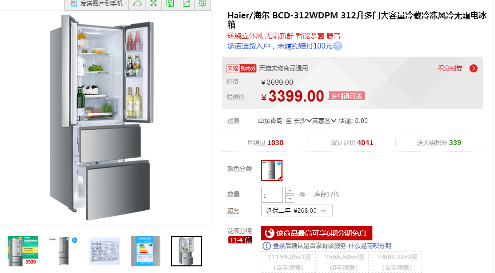 BCD-312WDPM 312升多门大容量冷藏冷冻风冷无霜电冰箱