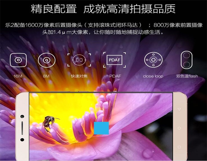 乐2是全球首款搭载Helio X20十核处理器手机,主频2.3GHz,拥有3GB内存以及32GB存储空间组合,支持全网4G+、双卡双待,电池容量3000mAh支持乐闪充快充技术,续航能力非常不错。此外,乐2拥有1600万像素后置摄像头和800万像素前置摄像头,自拍功能尤为强大。