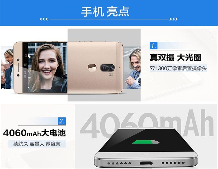 酷派cool1生态手机搭载了1920x1080像素分辨率的5.5英寸屏幕,搭载高通骁龙八核64位MSM8976处理器,内置3GB/4GB运行内存和32GB/64GB本地存储空间。采用两颗1300万像素摄像头,F2.0大光圈,一颗彩色+一颗黑白,6P镜头。它配有4060mAh容量电池(支持QC 3.0快充),支持乐镜指纹、全网通双卡双待。